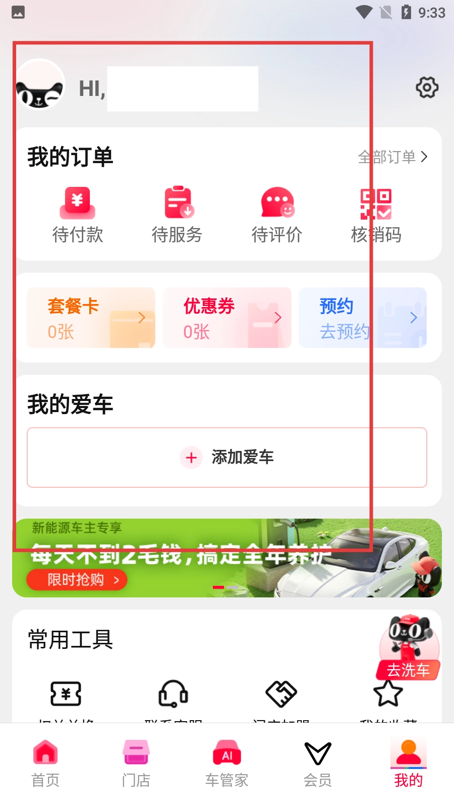 登录成功后,在【我的】页面能够查看【我的订单】【我的爱车】等内容,也可以执行添加爱车之类的操作。
