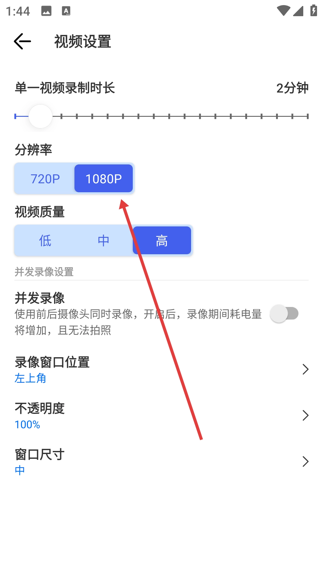 点击【1080P】选项,完成分辨率的设置操作,这样就能让视频录制效果更加清晰。