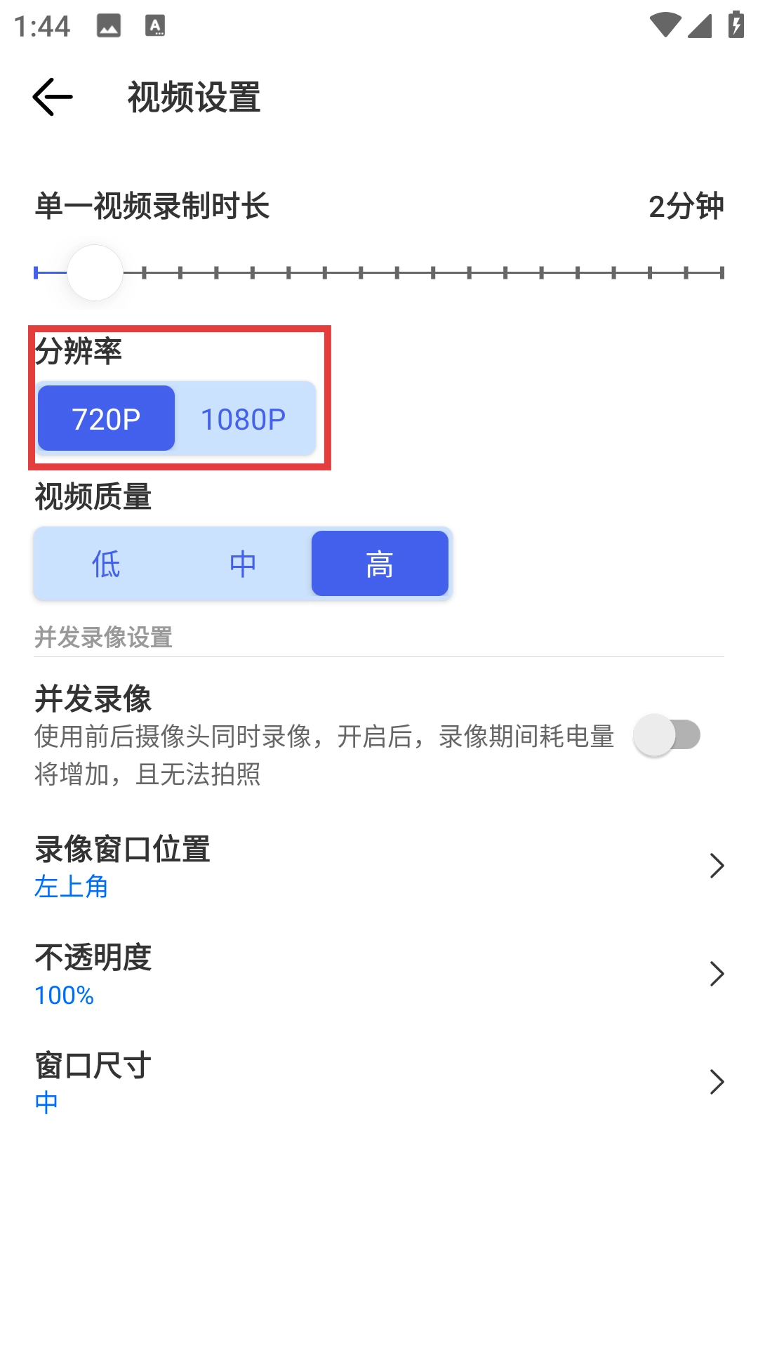 在视频设置页面找到【分辨率】选项,可选择【720P】或【1080P】。