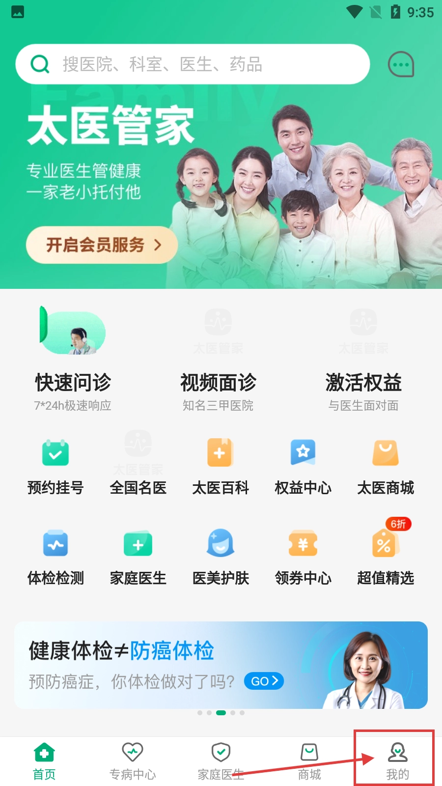 请打开【太医管家】应用程序,接着点击界面右下角的【我的】选项,这样就能进入到个人中心页面了。