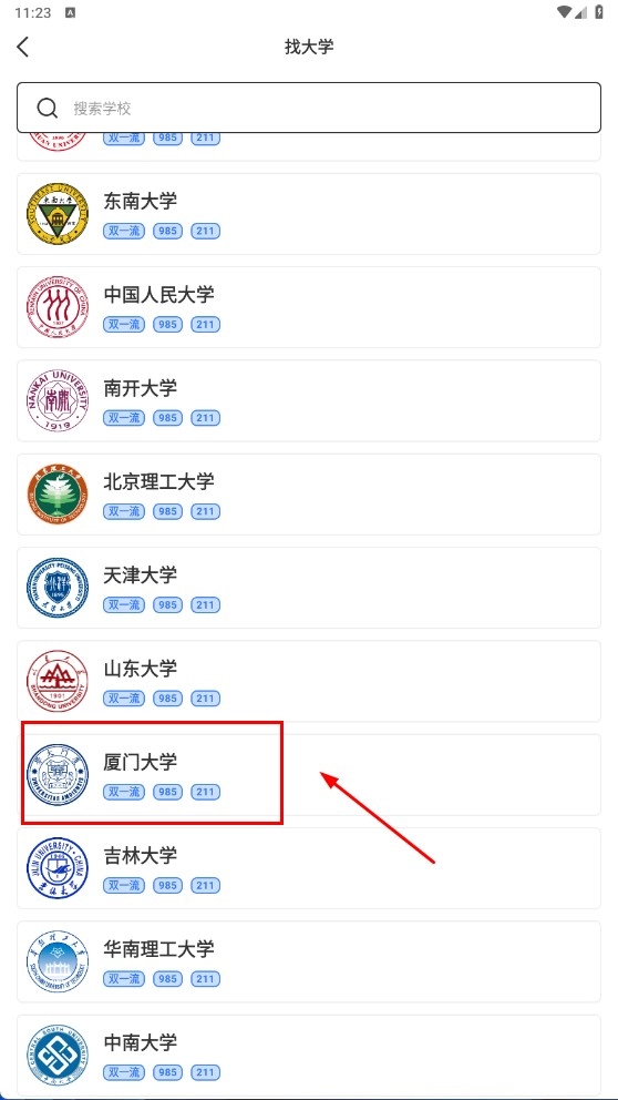在查找大学页面时,可以搜索或选择目标大学,例如【厦门大学-学校名称】。