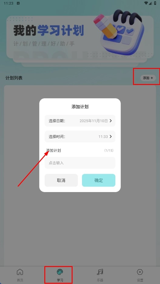 点击页面底部的【学习】功能按钮,进入学习计划界面后,点击【添加+】按钮就能创建新的学习计划。