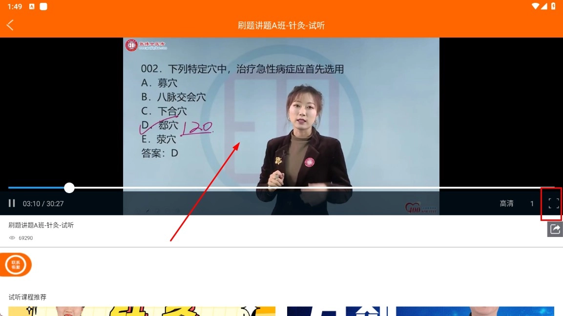 在观看试听课程的过程中,您可以点击全屏按钮,这样能更清晰地查看课程内容。