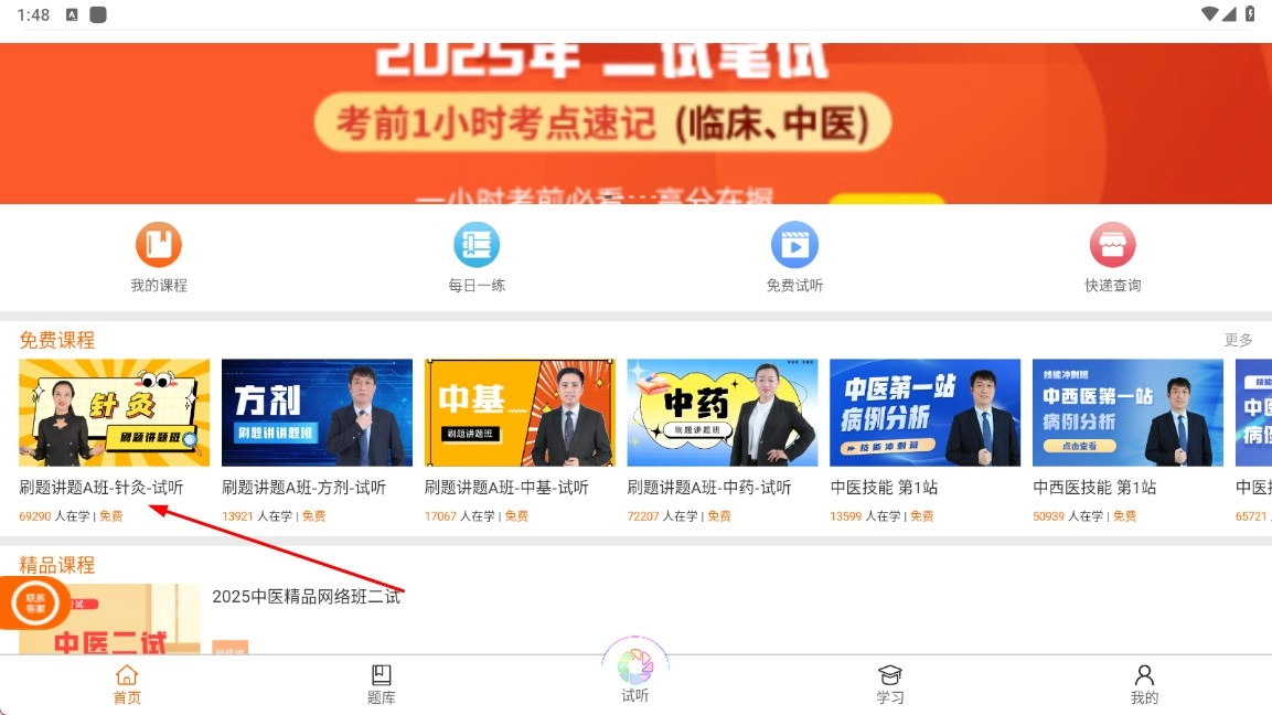 在首页找到并选择【刷题讲题A班-针灸-试听-课程】,点击进入该课程开始学习。