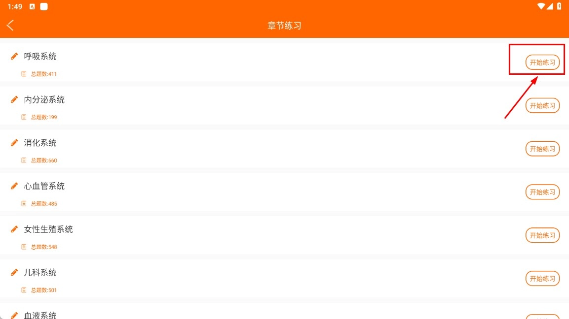 进入章节练习板块,找到并点击标有“开始练习”的按钮,即可开展呼吸系统等相关章节的习题训练。
