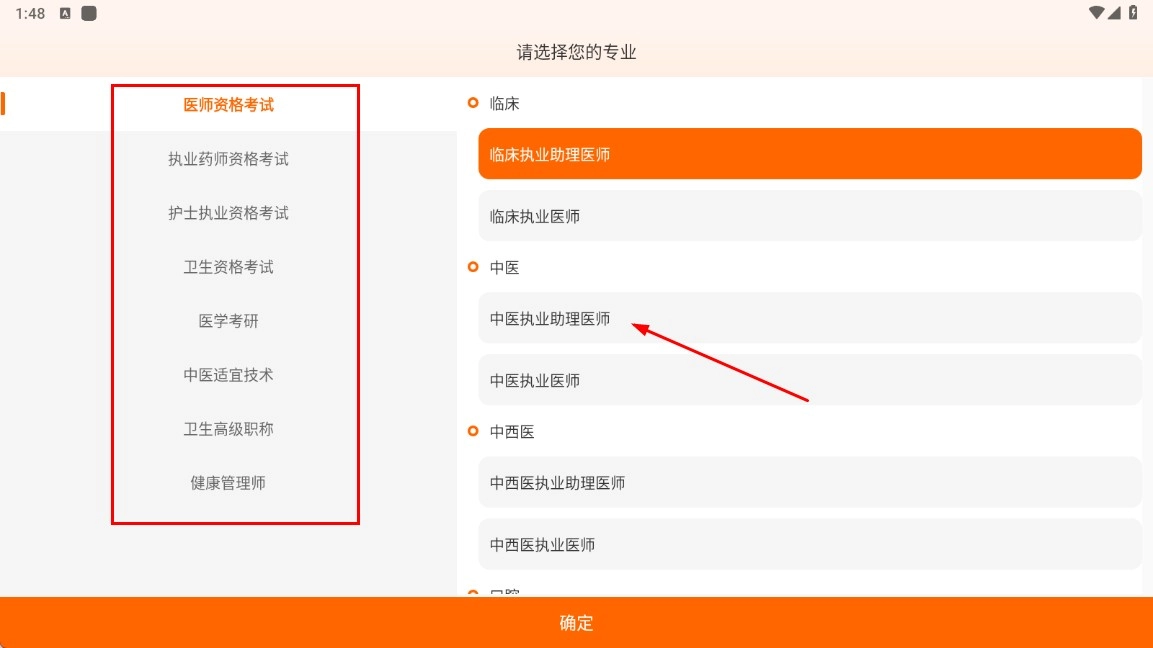 请先选择对应的专业类别,例如在【医师资格考试-类别】分类下选中【中医执业助理医师-选项】这一具体选项,之后点击确定按钮即可。
