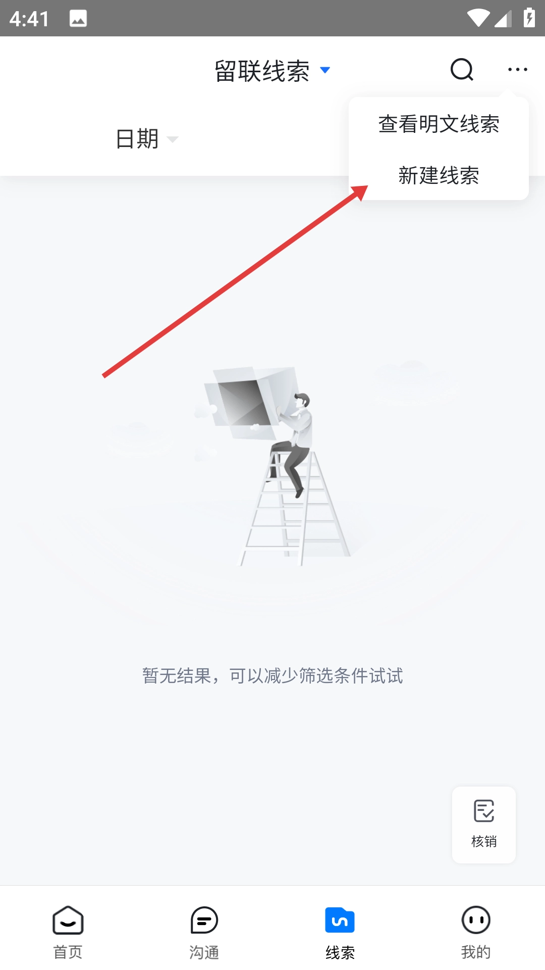 在**线索页面**,点击右上角的【...】按钮,系统会弹出操作菜单。