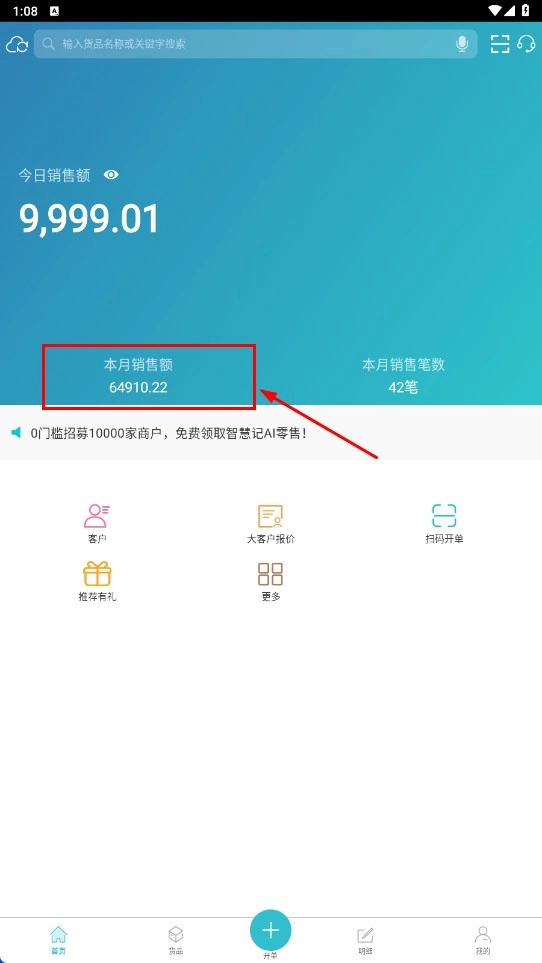 可以在首页找到【本月销售额-数据模块】并查看,以此了解销售数据的整体情况。