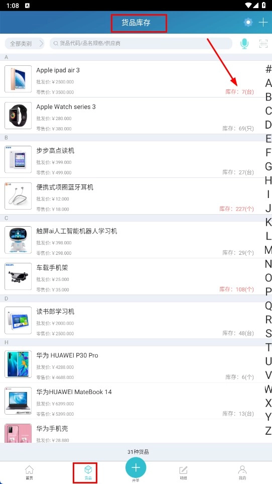 点击底部的【货品】功能按钮,进入货品库存页面后,即可查看各类货品的库存情况。