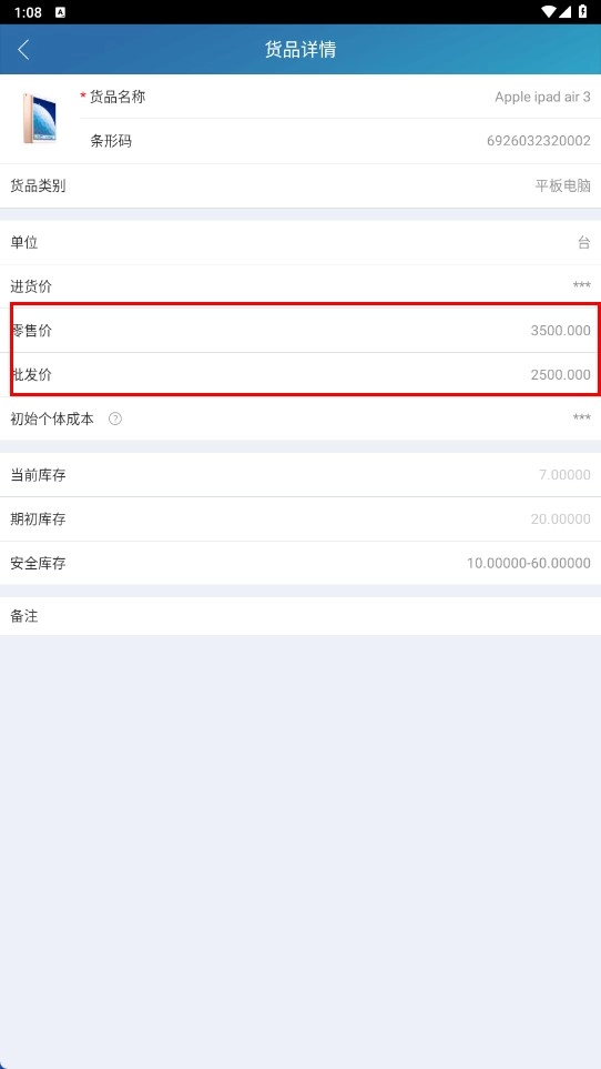 在货品库存页面点击目标货品,比如【ipad-air3-货品名称】,进入货品详情页后就能查看零售价、批发价等相关信息。