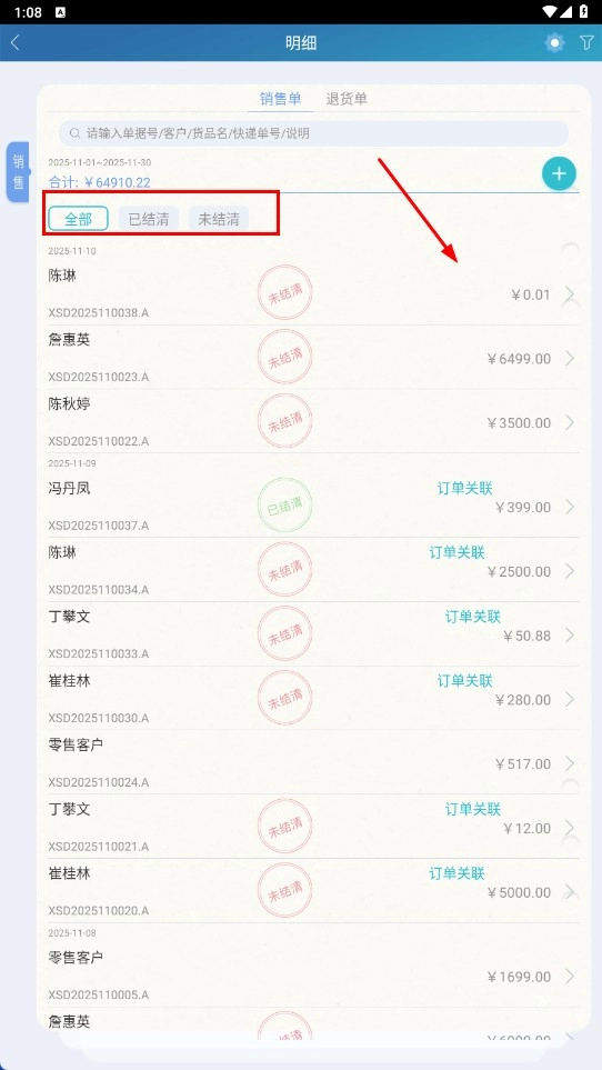 点击【明细】功能按钮,进入销售明细页面后,就能对全部、已结清以及未结清的订单进行筛选操作。