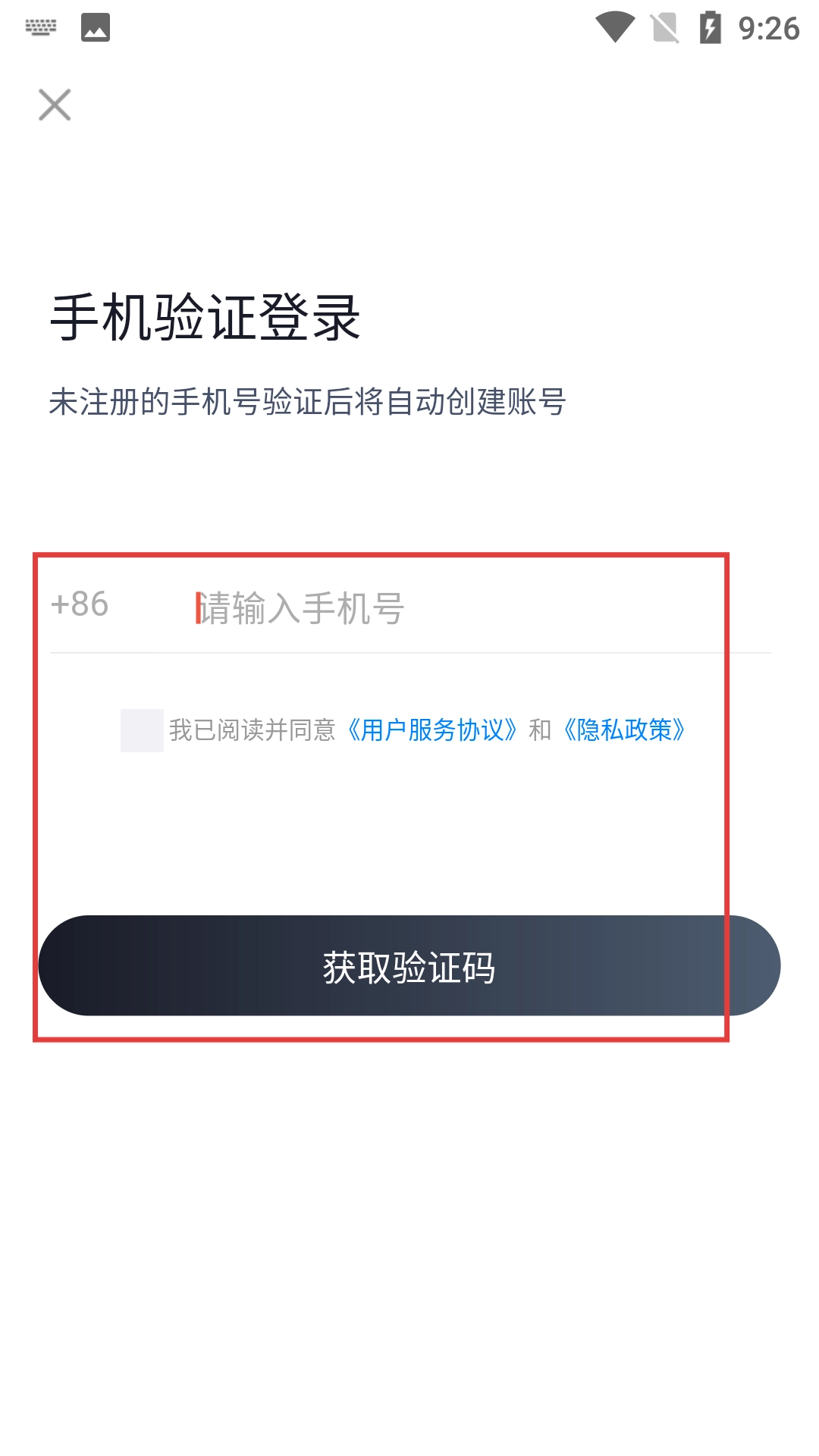 进入手机验证登录界面后,填写手机号,勾选同意相关协议,再点击【获取验证码】的按钮。