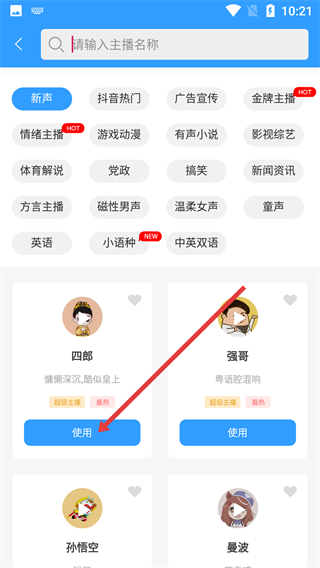 文字输入完成后,点击【更多主播】按钮,进入主播选择界面,能够按照不同类型进行筛选,比如抖音热门、广告宣传类的主播等。
