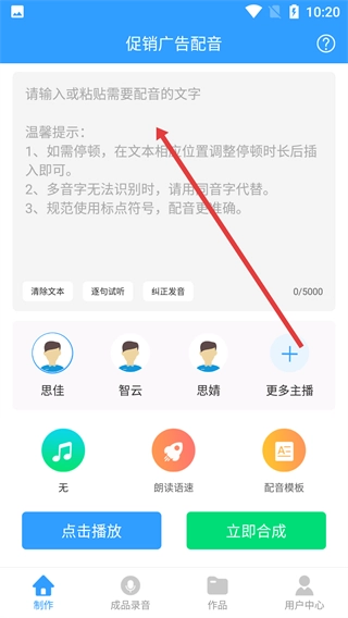 进入促销广告配音界面后,在对应的文本框内填入待配音的文字内容,要留意标点符号的正确使用以及合理的停顿安排,这样才能保证配音效果的准确性。