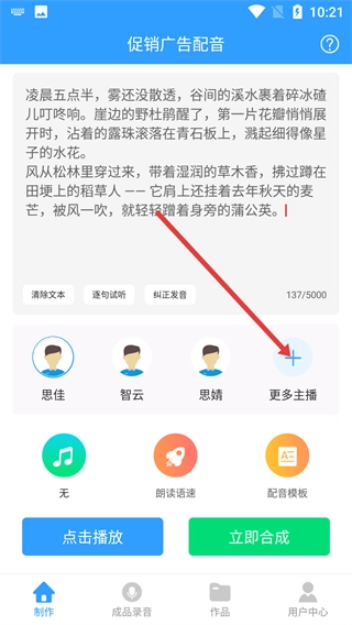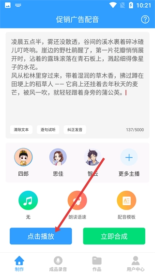 选好主播后,点击【点击播放】按钮试听配音效果,确认无误后即可开展后续的合成操作。