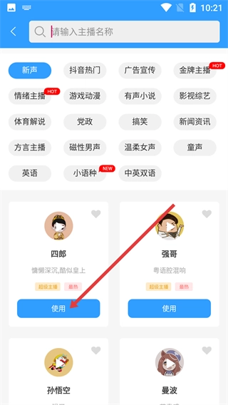你可以这样修改:在主播列表里挑选你喜欢的主播,比如【四郎】,点击【使用】按钮,就能把他设置成配音主播啦。