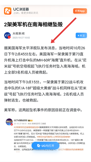 在新闻详情页面,可查看像【2架美军机在南海先后坠毁】这类新闻的详细报道,以知晓事件的具体情况。