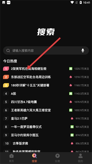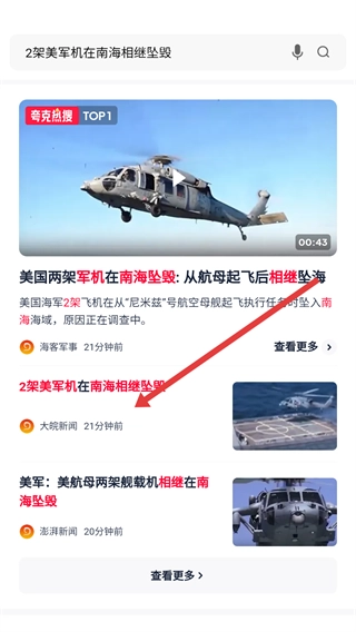 在搜索页面,点击今日热搜里的相关条目,比如【2架美军机在南海相继坠毁】,就能进入对应的搜索结果页面。