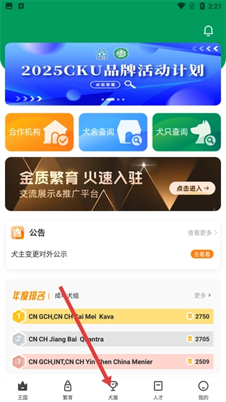 在软件首页底部找到【犬展】功能入口并点击,进入犬展页面后,就能查看犬展相关的活动信息以及排名情况。
