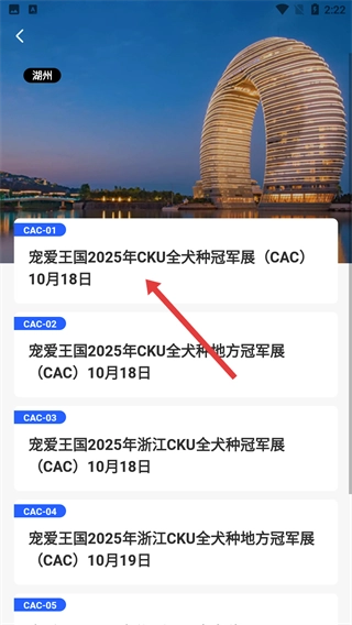 进入湖州犬展详情页面后,就能查看【宠爱王国2026年CKU全犬种冠军展(CAC)-10月18日】等相关展事信息,从而了解具体的展事安排。
