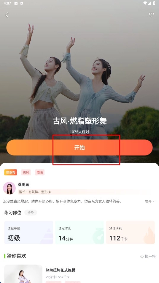 在筛选页面,挑选自己感兴趣的课程,例如【古风-燃脂塑形舞-课程卡片】。