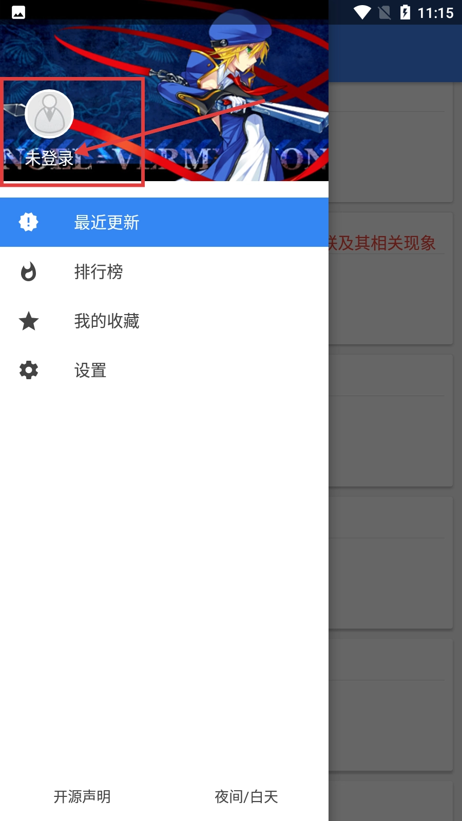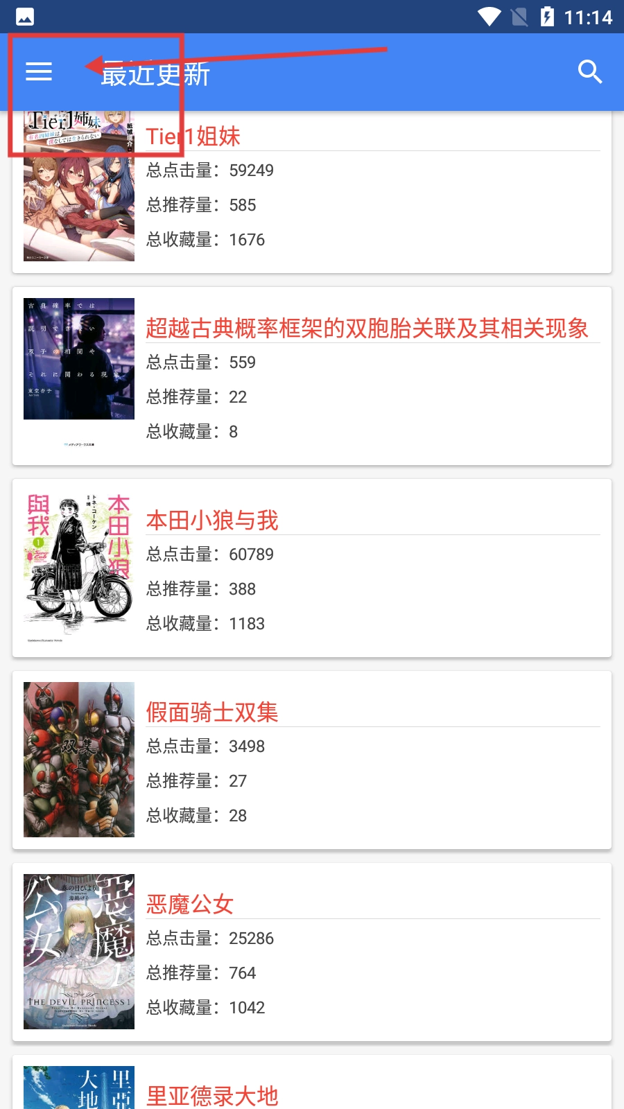 在“最近更新”页面,点击左上角的【三】条杠菜单按钮,就能展开侧边栏,进而查看排行榜、我的收藏等功能。