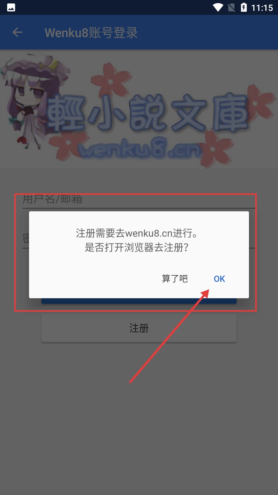 点击注册按钮后,系统会弹出提示,告知需前往wenku8.cn完成注册;点击【OK】按钮即可启动浏览器,进行后续的注册流程。