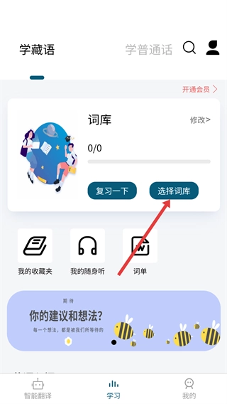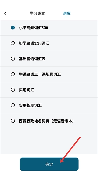 在学习板块的学藏语界面,点击【选择词库】按钮,即可进入词库选择界面。
