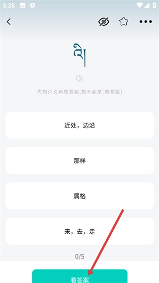 在学习答题的界面中,点击【看答案】按钮,就能查看题目对应的答案,从而开展藏语词汇的学习。