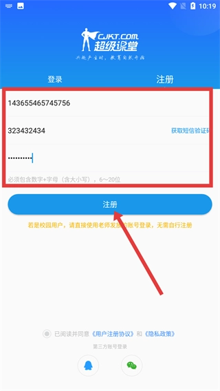 在注册页面,按顺序填写手机号、短信验证码,以及满足“数字+字母(包含大小写),长度6至20位”要求的密码,随后点击“注册”按钮,即可完成注册流程。