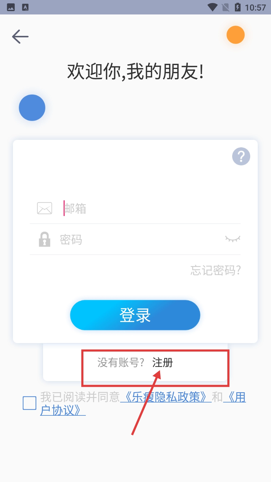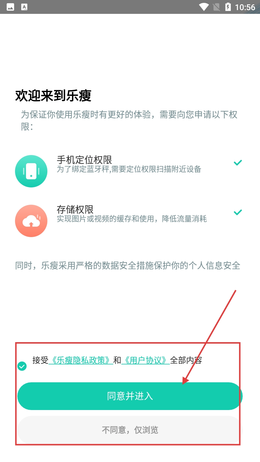 首次使用乐瘦应用时,请先仔细阅读并同意《乐瘦隐私政策》与《用户协议》,随后点击【同意并进入】按钮即可开启使用。