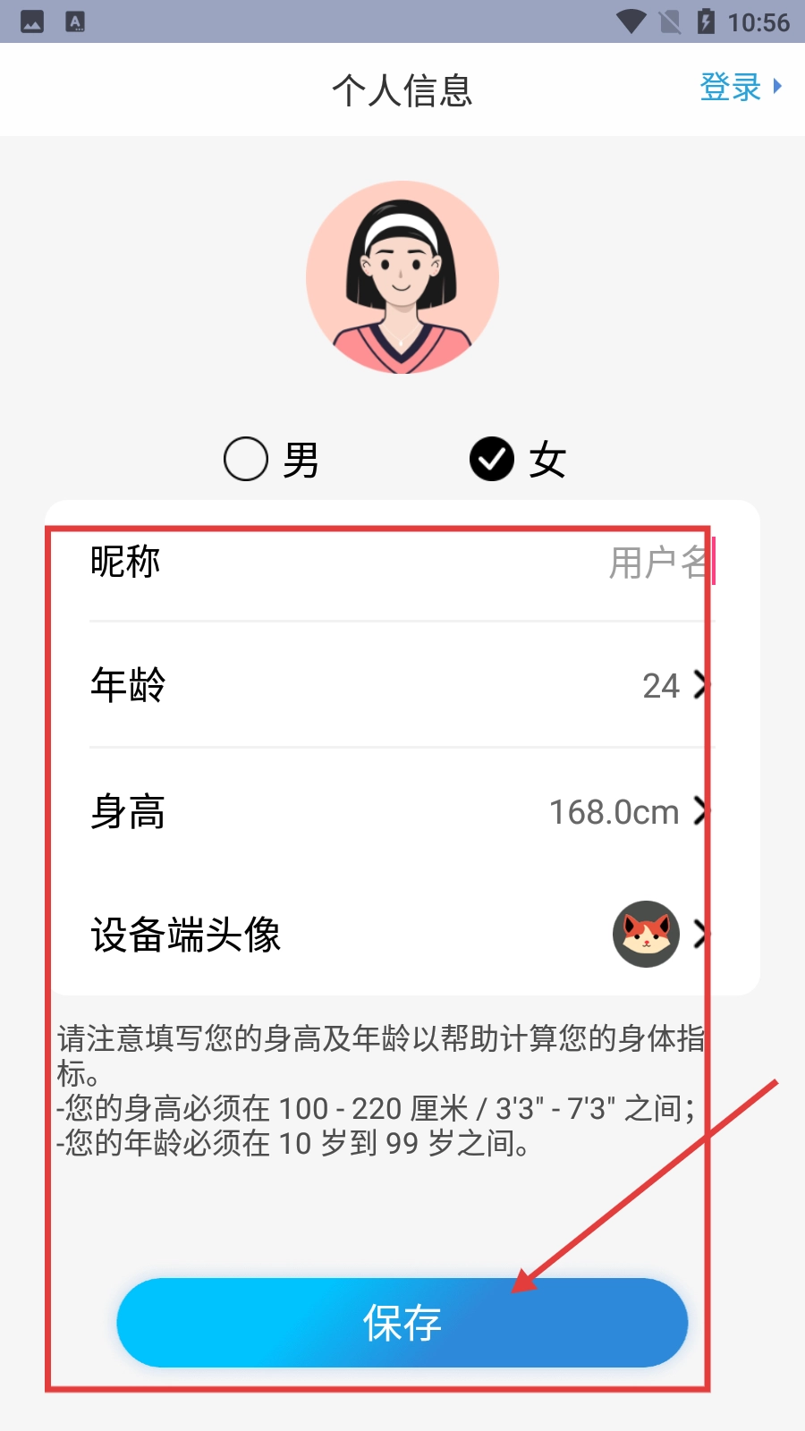 进入应用后,需要填写昵称、年龄、身高这些个人信息,同时还要设置设备端头像,等所有内容都填写好后,点击【保存】按钮就可以了。