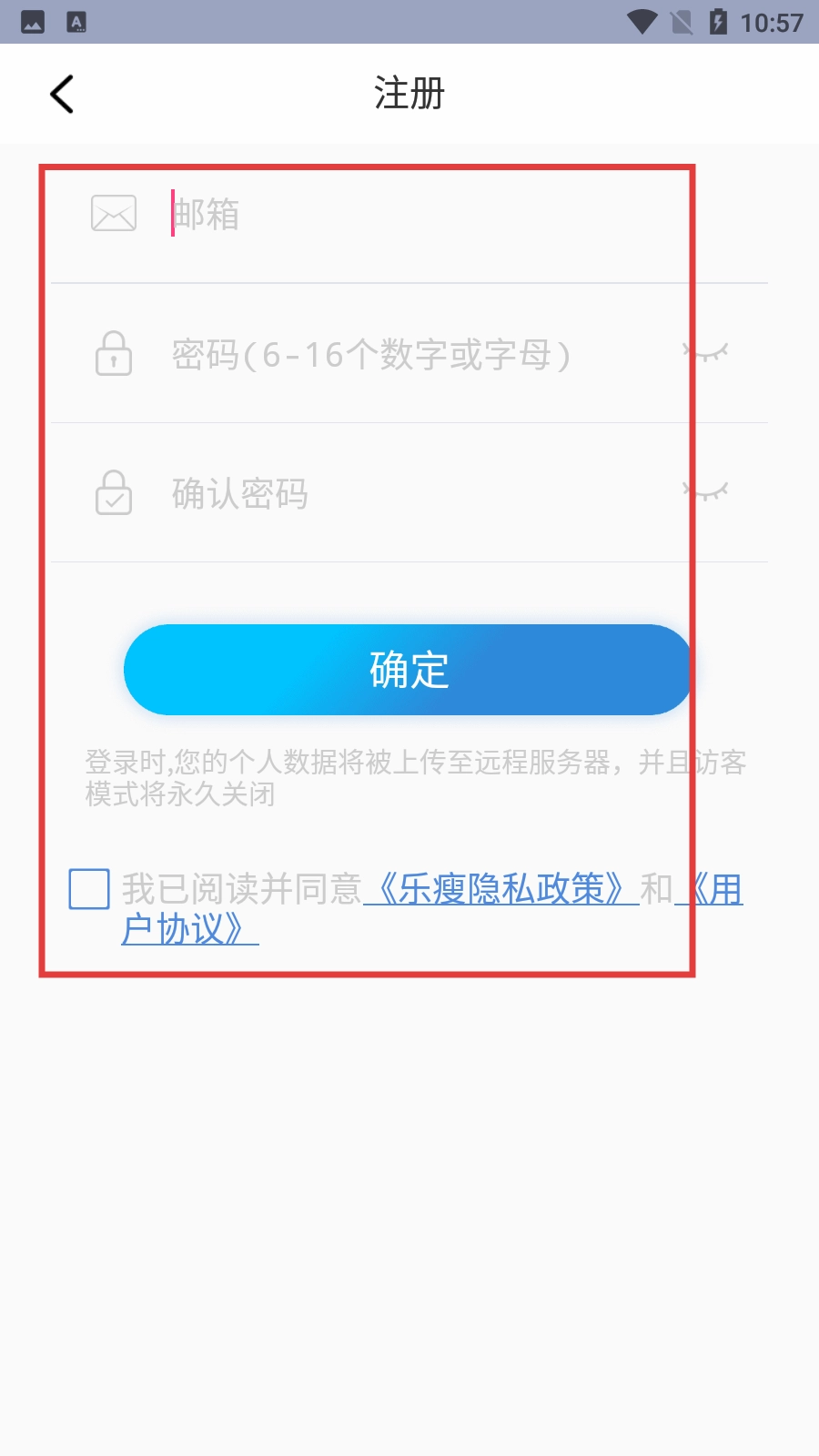 在注册页面,依次输入邮箱地址、设置登录密码并再次确认密码,勾选同意隐私政策与用户协议的选项后,点击【确定】按钮就能完成注册流程。
