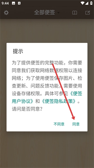 打开便签应用后,会弹出权限请求窗口,点击【同意】按钮,这样就能获得网络与存储权限,从而使用软件的全部功能。
