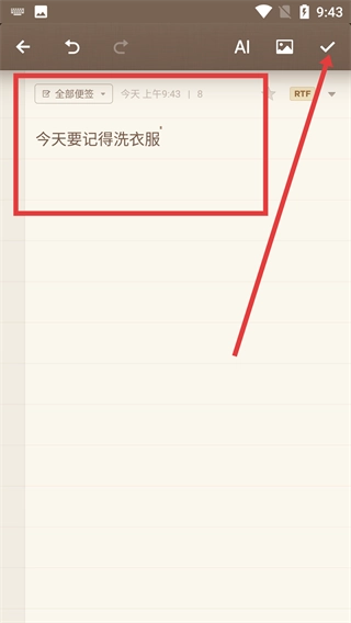 在编辑页面中输入相关内容,例如【今天要记得洗衣服】,然后点击右上角的对勾图标完成保存操作。