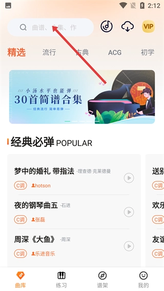 在音乐曲库页面,点击【搜索框】,就能进入搜索界面,开启曲谱查找。