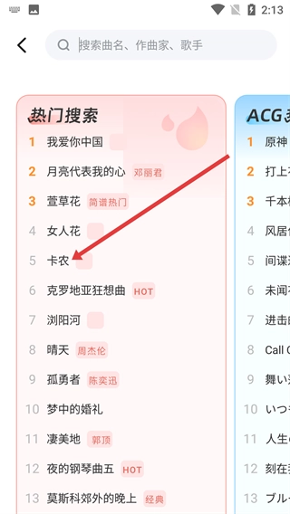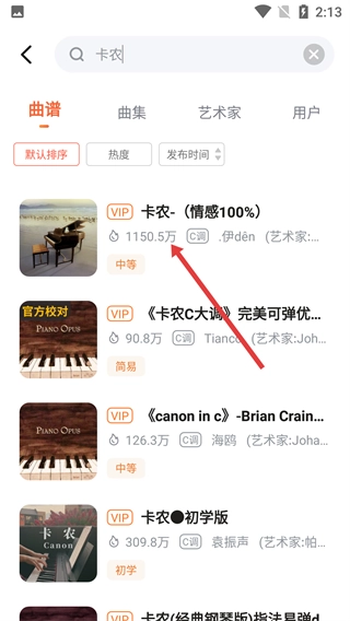 在搜索界面的热门搜索区域,点击【卡农】选项,即可进入曲谱搜索结果页面,浏览与之相关的曲谱内容。