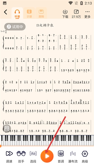 在曲谱详情页面,点击【播放】按钮后,就能进入听谱模式,开始聆听《D大调卡农》的曲谱了。