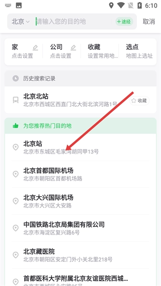 在目的地输入界面中,您可以选择或输入计划前往的目的地,例如【北京站】。
