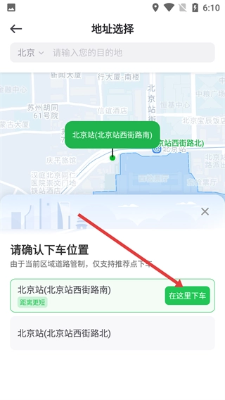 在地址选择页面,核实好下车地点后,点击【在这里下车】的按钮。