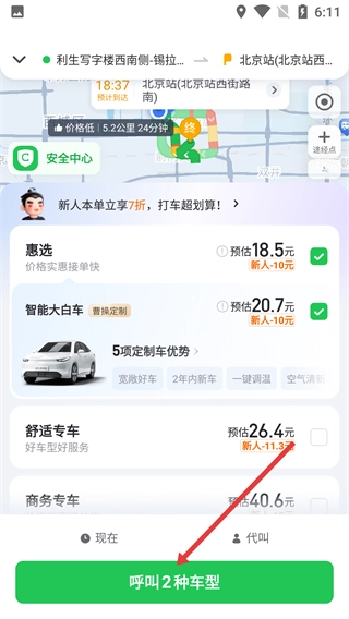 挑选好合适的车型后,点击【呼叫2种车型】按钮,即可发起打车请求。