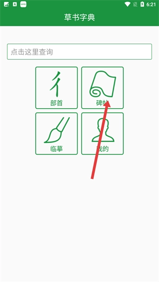 在草书字典的主界面上,找到并点击【碑帖】这一选项,随即进入碑帖列表界面,在这里就能浏览到各种各样的草书碑帖相关资源。