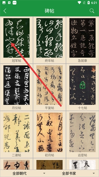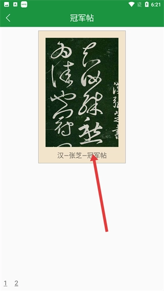 在碑帖列表界面,点击【冠军帖】选项,即可进入该碑帖的详情页面。
