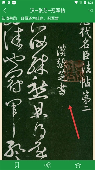 进入汉·张芝《冠军帖》的内容界面后,便能浏览此碑帖的草书文字与相关信息,开展书法鉴赏学习。