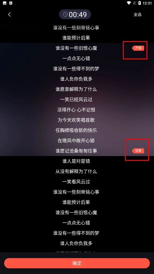 在片段选择页面,依次点击【开始】功能按钮与【结束】功能按钮,待片段范围确定后,再点击【确定】功能按钮。