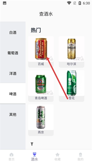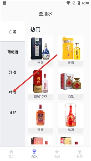 在软件首页,点击底部的【酒水】选项,进入酒水查询板块后,就能查看各类酒水的分类信息。