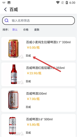 在啤酒列表界面,点击【百威】,进入百威啤酒的具体产品页面。