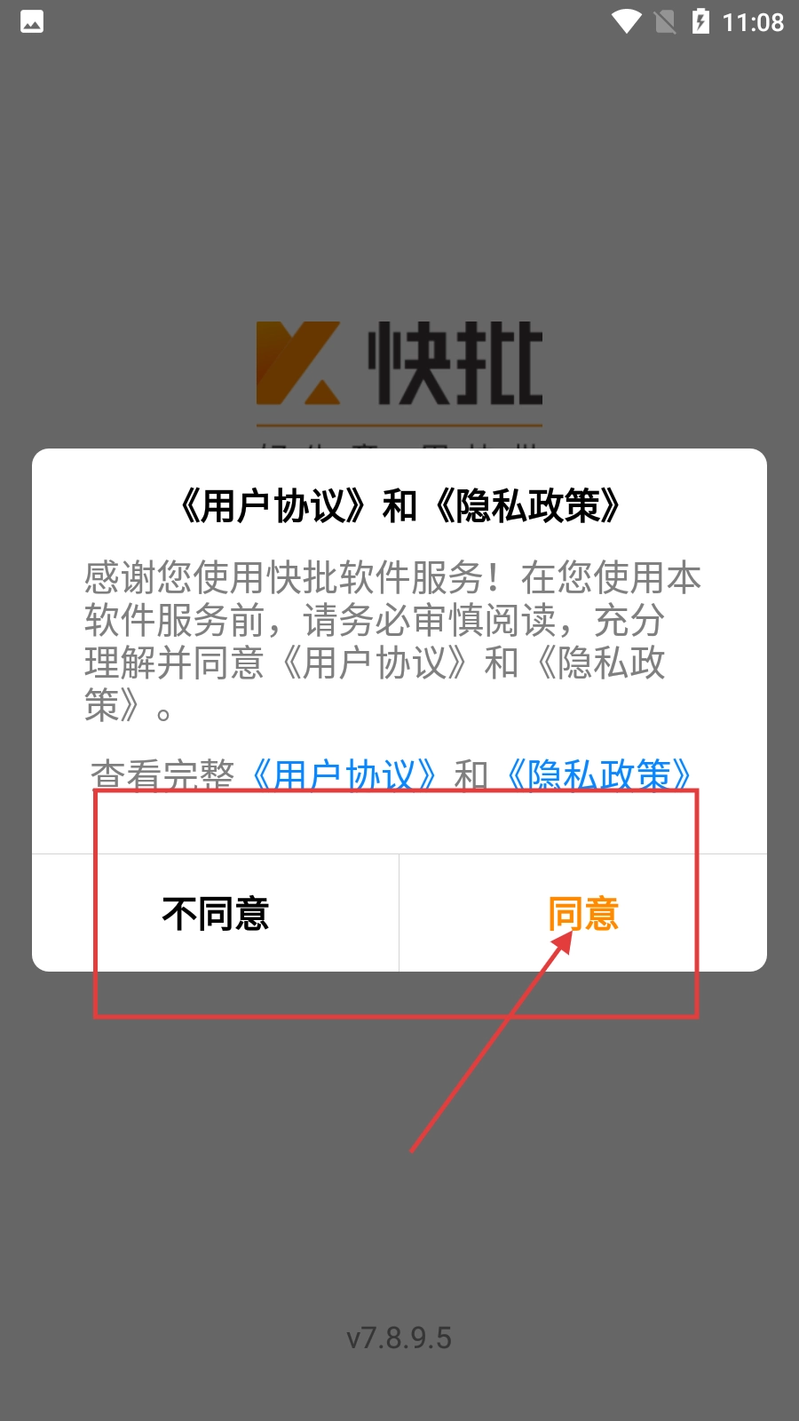 首次使用快批软件时,系统会弹出《用户协议》与《隐私政策》的窗口,您需要仔细阅读相关内容,之后点击【同意】按钮,才能继续使用软件的各项功能。