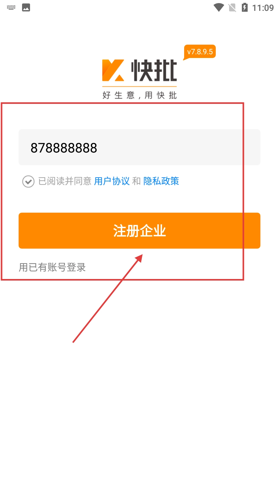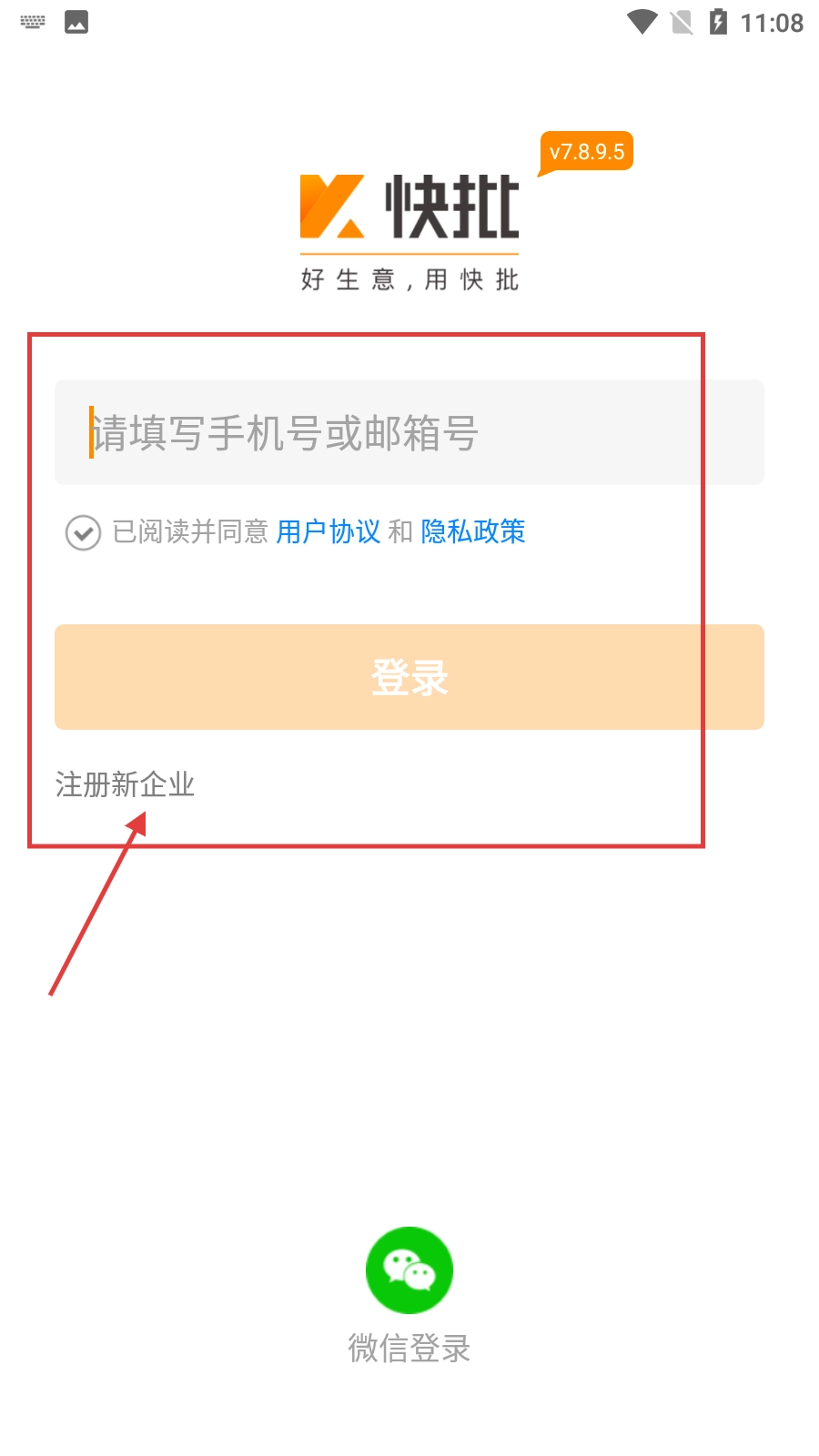 在企业注册页面,输入手机号或电子邮箱地址,勾选同意相关协议后,点击【注册企业】按钮即可推进后续注册流程。