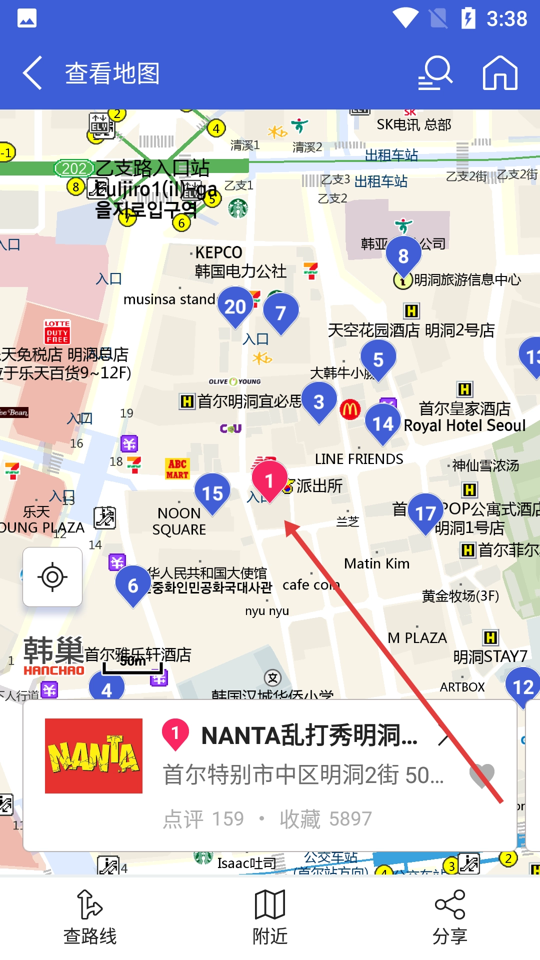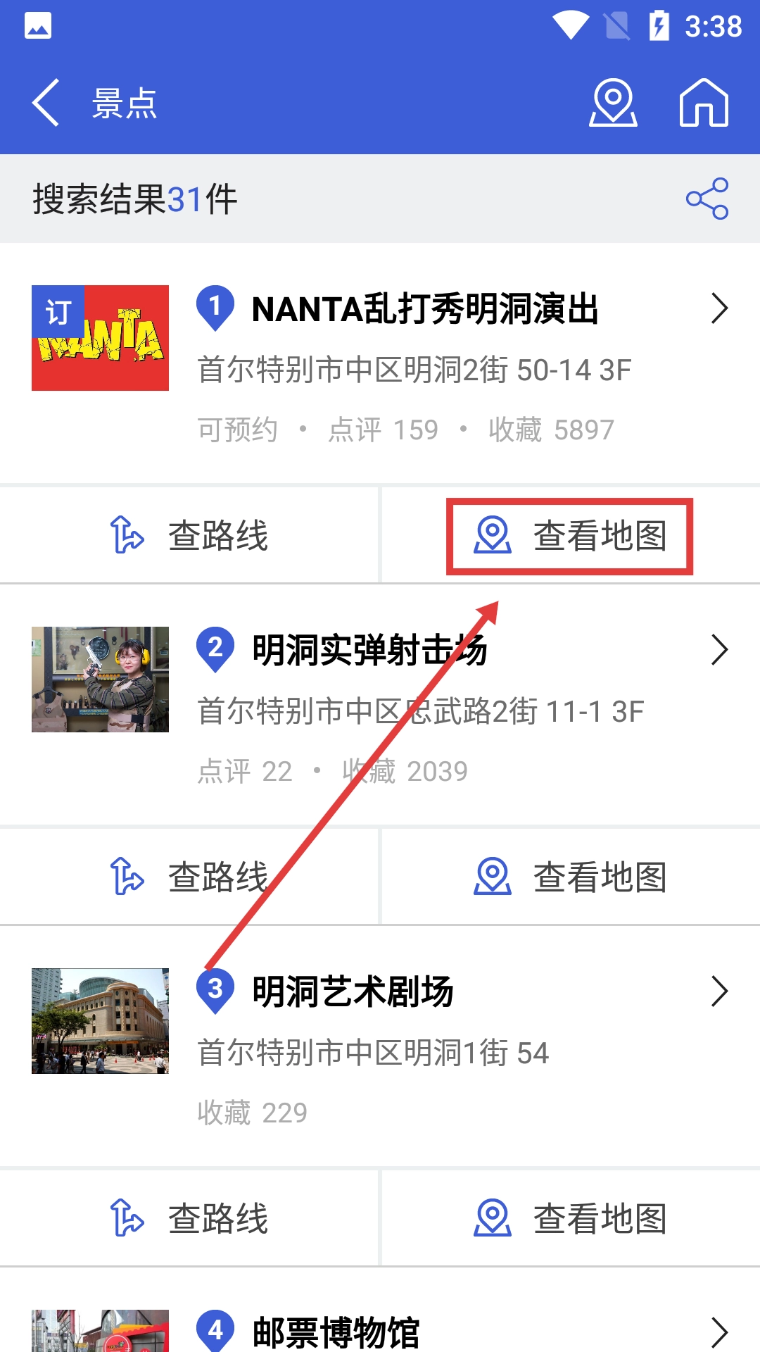 在景点列表里挑选你想找的景点(比如NANTA乱打秀明洞演出),然后点击【查看地图】按钮。